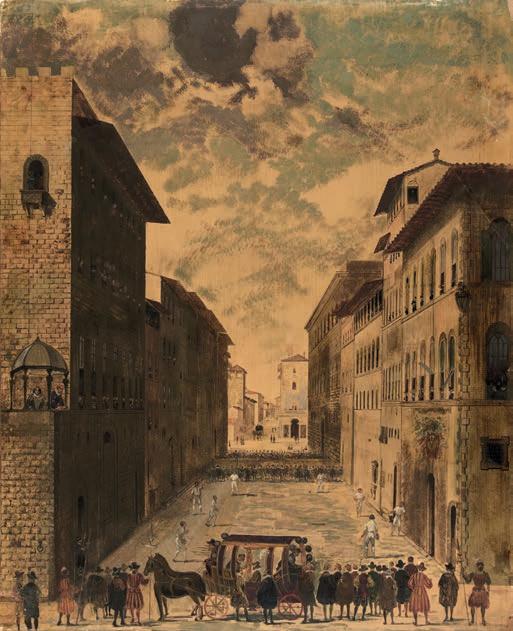 Edelinck’s dramatic engraving depicts the Battle of the Standard, the central section of an ambitious mural by Leonardo commemorating the Florentine victory over the Milanese army during the Battle of Anghiari in 1440, in the Sala del Gran Consiglio (Great Council Hall) of the Palazzo della Signoria in Florence, facing which was another fresco by Michelangelo on the Battle of Cascina. Prior to their execution both Leonardo and Michelangelo’s full-scale preparatory cartoons were exhibited and much admired by younger artists and acclaimed by Benvenuto Cellini as a “school for the world” (scuola del mondo). Neither work now exists. Only a few extant autograph sketches and drawings document Leonardo’s design, although the battle composition is preserved in later copies such as Rubens’ drawing now at the Louvre (from which Edelinck’s print is derived), as well as the Ruccellai drawing reproduced in Niccolo Pagni and Giuseppe Bardi’s Etruria Pittrice (1791-95).