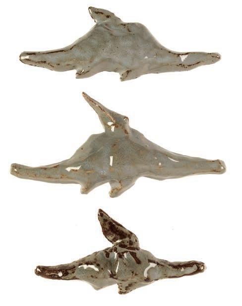 406AR* Abrahams (Ivor, 1935-2015). Three Bronze Bird Figures, ceramic, three green gray birds with touches of brown, ‘11/30’ in black pen to bottom of each, longest length 25 cm (9 7/8 ins)