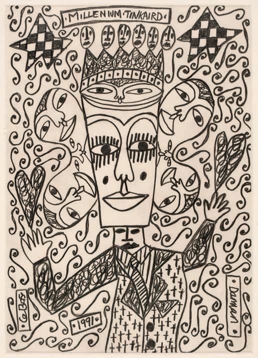 American folk artist Howard Finster was a Baptist minister from Georgia, who started preaching when he was only 16, having become a Christian at the age of 13. His creations of outsider art were both naïve and visionary, and intended to help spread the Christian gospel. In the 1960s Finster transformed the swampy land behind his house into a sculpture park called Paradise Garden, containing thousands of works of art. His creations typically feature fantastical landscapes, historic figures such as George Washington and Elvis Presley, animals and celestial beings, adorned with handwritten Bible verses and religious exhortations. Finster’s renown spread further with the production of album cover designs for R.E.M. and Talking Heads in the 1980s.