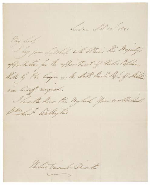 425* William IV (1765-1837). King of the United Kingdom of Great Britain and Ireland, 1830-37. Document Signed, ‘William R’, Saint James’s, 16 December 1831, pre-printed form on vellum with manuscript insertions, appointing John Kenneth Mackenzie as Second Lieutenant in the 21st Regiment of Foot, countersigned by Lord Melbourne, papered seal and duty stamp applied to left margin, light soiling, 23.5 x 34 cm, together with: Seven Years War (1756-63). A letter written by a Captain of Marines on board the Portland off Cape St. Vincent to the Earl of Lauderdale of Hatton, giving details of an action four days previously, c. 1758, 3-page letter detailing the attack made by Admiral Boscowen’s fleet when at anchor in Gibraltar Bay against a French squadron, the writer of the letter took part in the battle and gives information regarding other actions between Lagos and Cape St. Vincent, verso of letter address to the Rt. Hon. Lord Lauderdale at Hatton near Edinburgh, and bears a London postal Bishop Mark stamp 11/SE, Wellesley (Arthur, Duke of Wellington, 1769-1852). Corrected Authorized and Official Programme of the State Funeral Procession of the Late Field Marshall Arthur Duke of Wellington, K. G. to be solemnized in Saint Paul’s Cathedral, on Thursday, the 18th day of November, 1852, including the Earl Marshal’s instructions to persons joining in the procession, and having tickets for the Cathedral, London: John Limbird, [1852], 8 pp., light dust-soiling, slim 8vo, George II Proclamation. By the King, A Proclamation ... the General Assembly of the Church of Scotland, that a day of fasting and humiliation may be observed throughout that part of our kingdom of Great Britain..., Edinburgh: Printed by John Mosman and William Brown, the Assigns of James Watson deceased, 1726, single-sheet broadside printed to one side, upper blank margin with contemporary annotation ‘Shire of Lanark’, light spotting and damp mottling, frayed at head and foot and few closed tears, folio (41 x 31.5 cm), plus approximately 40 other miscellaneous 17th-19th century ephemeral items including letters, documents, mounted clipped signatures of Robert Peel & Henry James, and few early 19th-century newspapers, etc., loosely contained in plastic sleeves in modern ring binder (a folder)