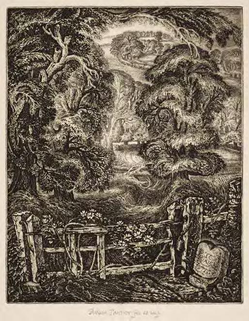 304 Tanner (Robin, 1904-1988). Illustration for Thomas Gray’s Elegy, 1980, etching, signed with initials in pencil and dated 1981, as published in Thomas Gray, Elegy written in a Country Churchyard, published by Robin Garton, 1981, in an edition of 100, plate size 13.8 x 14.4 cm (5 1/2 x 6 ins), sheet size 25.5 x 18.5 cm (10 x 7 1/4 ins), all edges gilt, original dark brown quarter morocco gilt, with paper wrapper, and publisher’s cardboard box, small 4to Garton 41 (ii/ii). This copy numbered 90 of 100 copies, signed by Robin Tanner to the limitation leaf.