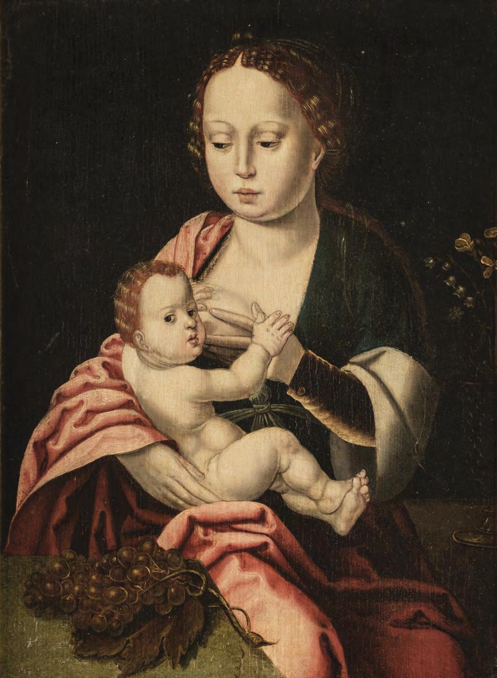 2* Master of the Parrot (active Antwerp, 1525-1550). Virgin and Child with bunch of grapes, oil on wood panel, of the Virgin Mary seated, presenting her breast to the Christ child, with a bunch of grapes on the corner of a table before them, and flowers in a goblet to the right, 38 x 28 cm (15 x 11 ins), old recessed gilt frame
