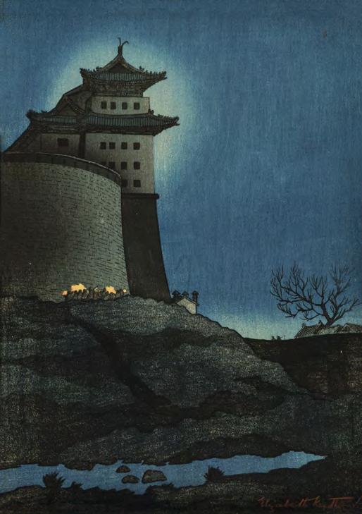 253AR* Keith (Elizabeth, 1887-1956, エリザベス キース). Outside the Te-Sheng-Men, Peking (北京城門の月), 1921, colour woodblock print, printed by Watanabe, signed in red pencil lower right, titled in red pencil to lower left, image size 37.5 x 26.5 cm (14 3/4 x 10 3/8 ins, with short blank margins, additionally inscribed by the artist in pencil to lower left ‘With the artist’s compliments’ (trimmed with partial loss of the inscription), laid down on backing card, sheet size 39 x 27.5 cm (15 1/4 x 10 3/4 ins), period gilt frame, glazed, with original framer’s label of The Graves Gallery, Fine Art Dealers, 44 Cherry Street, Birmingham to verso