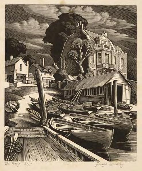 278* Mackley (George, 1900-1983).The Ferry, 1951, wood engraving on cream wove paper with Basingwerk Parchment watermark, from the edition of 75 impressions, signed, titled, and numbered 4/75, with wide margins, a few light spots, hinged on to card mount, image size 150 x 127 mm (6 x 5 ins), sheet size 249 x 182 mm, together with Barn at Giethoon, 1968, wood engraving on japon, signed, titled, and numbered 73/75, with margins, tipped on to card mount, image size 99 x 125 mm (4 x 5 ins), sheet size 205 x 210 mm, plus Island Slipway, circa 1930, wood engraving on thin laid paper, signed, titled, numbered 30/75, with margins, tipped on to card mount, image size 126 x 176 m (5 x 7 ins), sheet size 187 x 256 mm