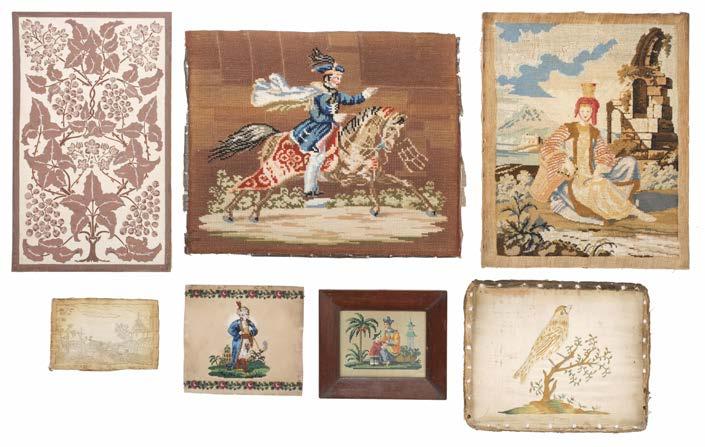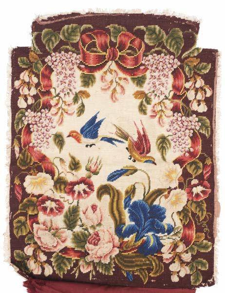 648* Tapestry. Three chair seat covers, Victorian, comprising a pair of tapestry panels, worked in polychrome wools in gros point, with a pair of colourful swallows within a frame of flowers and grapes entwined with a red ribbon tied in a bow at the top, one panel cut dowm, approximately 75 x 56 cm (29.5 x 22 ins) and 63 x 61 cm (24.75 x 24 ins), and a smaller tapestry panel similar, depicting roses, morning glory, and pansies, 48 x 49.5 cm (18.75 x 19.5 ins), all 3 threadbare in places, but colours bright (3) £100 - £200