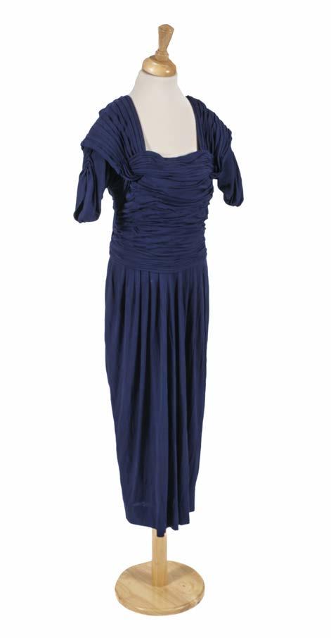653* Worth (House of). A 1930s cocktail dress, dark blue silk georgette(?) dress, with square neckline to front and v-shape to back, pleated bodice with knot detail, ruched short sleeves, and 3/4 length skirt, metal zip closure to back, fully lined, woven label ‘Boutique Worth Paris’, a few small marks, but overall in good condition, bust 76 cm (30 ins), waist 60 cm (23.5 ins), sleeves 18 cm (7 ins), length 108 cm (42.5 ins), together with 10 other early-mid 20th century garments, including: a moss green satin cocktail dress with strapless ruched crepe bodice, with Harrods label (size 34); a 1950s 3/4 length moss green taffeta dress with cap sleeves (latter a little worn at edges), and large ruched border to skirt terminating in an over-sized bow to rear; a puce pink satin cocktail dress with straps, with woven label ‘Suzy Perette New York’; a pale grey silk 3/4 length coat, with peach lining, 3/4 length sleeves with upturned cuffs, and large pocket flaps with Turk’s head buttons; a fitted sleeveless brown cocktail dress with gored skirt, woven label to waist ‘Jacques Heim Paris Cannes Biarritz’, various sizes and condition (mostly in good condition), plus 9 20th century hats, including 2 with Bergdorf Goodman label, and 2 Harrow school caps, one with ‘W.A. Stimson Ltd’ label (22)