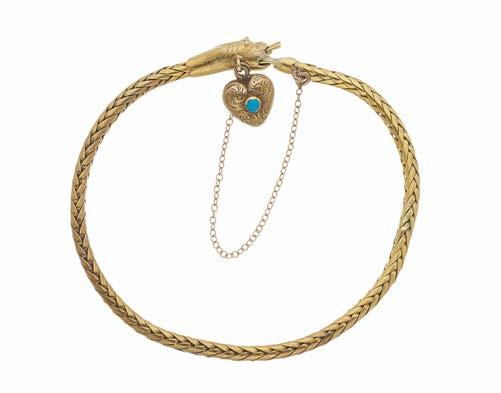 2 A late Victorian gold snake bracelet, with turquoise heartshape locket drop, length of drop 1.1cm, length of bracelet 17cm, 8.1g £200 - £400