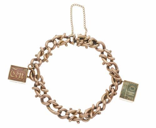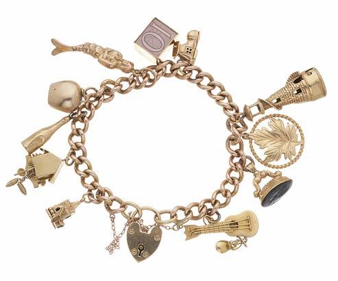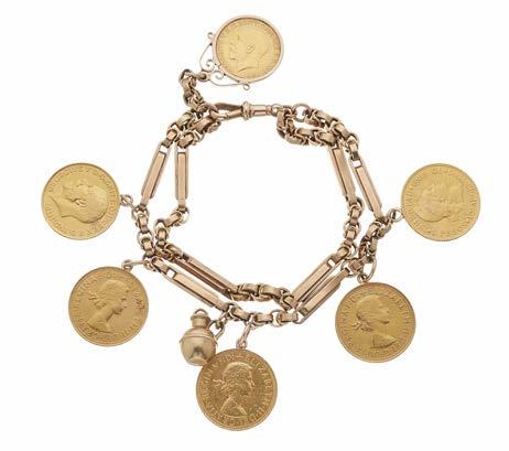 15 A late Victorian 9ct gold Albert chain, suspending a selection of six gold coins and a gold charm, chain stamped 9c, length of chain 19.2cm, total weight 63.1g £1,500 - £2,000