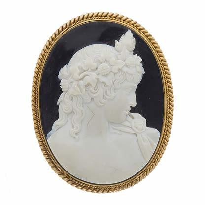 16 A mid 19th century carved agate cameo brooch, depicting Dionysus in profile, with cannetille surround, length 6.3cm, 67.5g