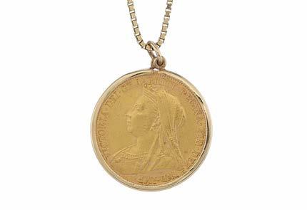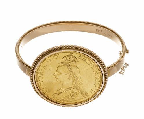 25 Victor ia, an 1887 Five Pounds coin, within a 15ct gold hinged bangle bracelet mount, maker’s marks for J.W. Henson, stamped 15ct, inner diameter 5.7cm, with maker’s case, total weight 61.6g