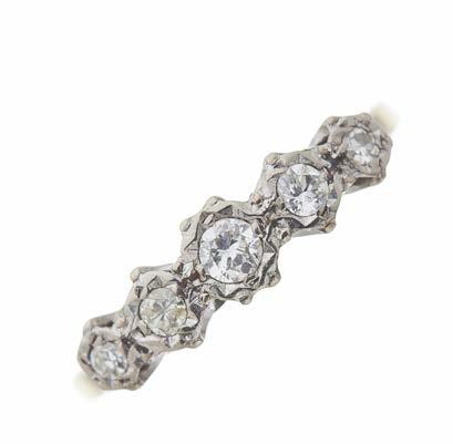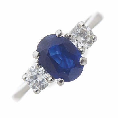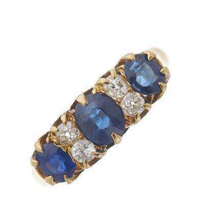 51. An early 20th century gold graduated sapphire threestone ring, with old-cut diamond double spacers, estimated total diamond weight 0.40ct, ring size Q, 4.1g £300 - £400