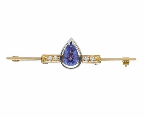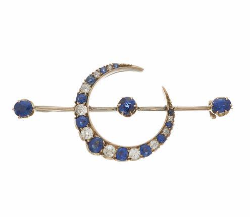11. A late Victorian gold sapphire and diamond crescent bar brooch, estimated total diamond weight 0.60ct, H-I colour, VS clarity, length 5cm, 6.2g