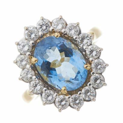 32 An 18ct gold aquamarine and brilliant-cut diamond cluster ring, aquamarine estimated weight 3.70ct, estimated total diamond weight 1.10ct, I-J colour, VS clarity, hallmarks for Birmingham, ring size O, 7.6g
