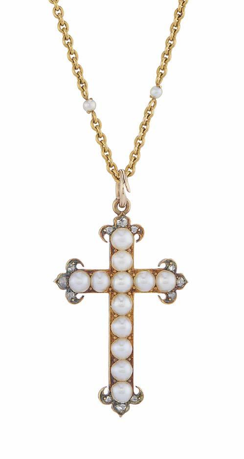 17 A late Victorian 15ct gold pearl and rose-cut diamond cross pendant, suspended from a seed pearl accent gold chain, length of pendant 5.6cm, length of chain 37.5cm, total weight 19.5g