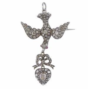 23 A fine and rare mid 19th century white metal vari-cut diamond Saint Esprit pendant, designed as a peace dove in flight, holding a rose-cut diamond heart-shape drop in its beak, may also be worn as a brooch, principal diamond estimated weight 0.50ct, length 5cm, 13g £4,000 - £6,000