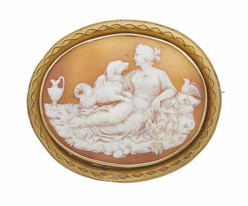 14 A late Victorian gold shell cameo brooch, carved to depict a reclining lady amongst animals, length 6.9cm, 24.8g