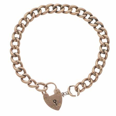 47. An early 20th century 9ct gold gate bracelet, with heartshape padlock clasp, stamped 9ct, length 18cm, 21.8g