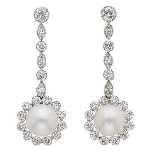 41 A pair of 18ct gold cultured pearl and diamond drop earrings, cultured pearls measure approximately 8.8mm, estimated total diamond weight 2.50ct, I-J colour, VS2-SI1 clarity, hallmarks for London, length 4cm, 9.7g £2,000 - £3,000