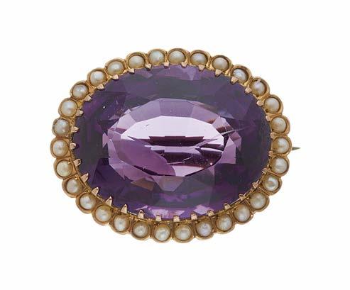 8 A late Victorian 9ct gold amethyst and split pearl brooch, mount stamped 9c, length 2.2cm, 5.1g