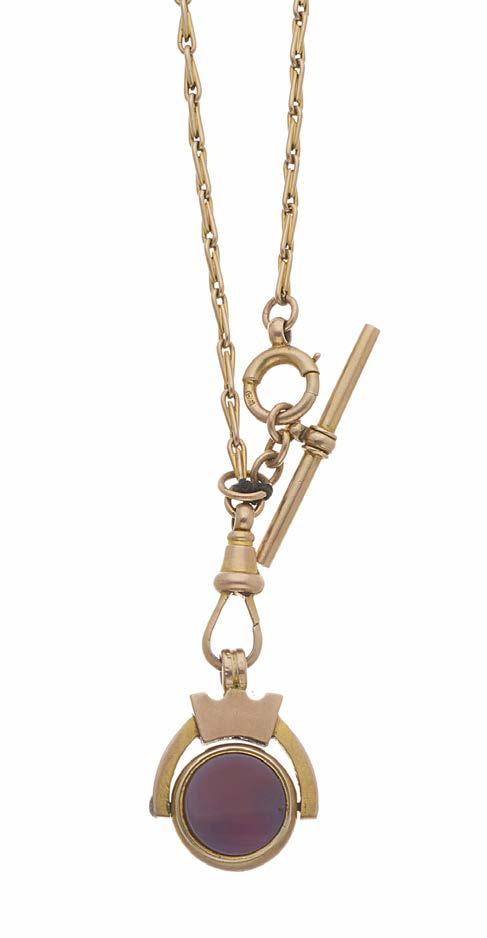 7. A late Victorian 9ct gold seed-link Albert chain, with T-bar, suspending a 10ct gold agate and bloodstone swivel fob, stamps to indicate 9ct and 10ct gold, total length 35.5cm, total weight 11.7g