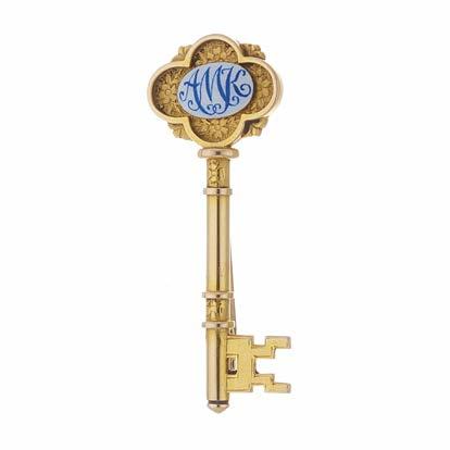10 A late Victorian 15ct gold key brooch, with floral engraved quatrefoil terminal and enamel monogram highlight, stamped 15, length 4.4cm, 8.2g