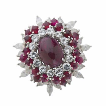 37 A platinum vari-shape ruby and brilliant-cut diamond cluster ring, with similarly-cut diamond line shoulders, estimated total diamond weight 0.60ct, ring size M, 4.6g £800 - £1,200