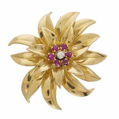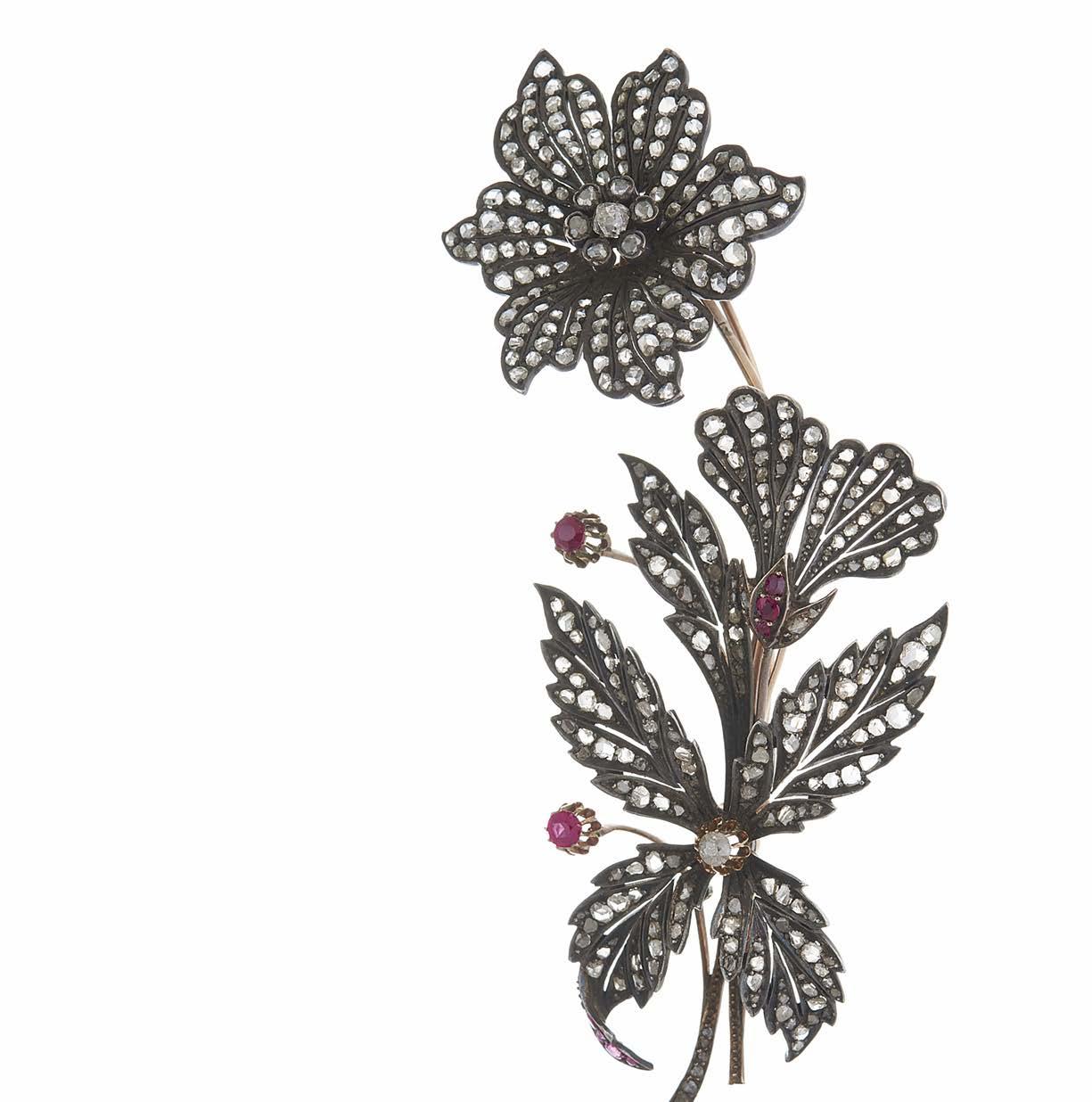 24 A mid to late 19th century silver and gold, old and rosecut diamond articulated floral spray brooch, with ruby highlights, old-cut diamond estimated weight 0.50ct, I-J colour, P1 clarity, length 12.7cm, 38.3g