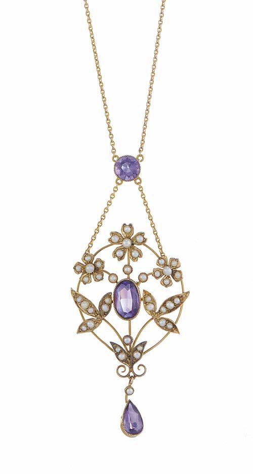 53. An Edwardian 9ct gold amethyst and seed pearl floral openwork necklace, suspending a pear-shape amethyst and split pearl drop, stamped 9ct, length of pendant 6.4cm, length of necklace 39.5cm, 6g