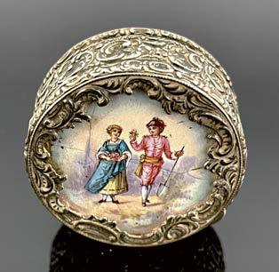 21 A Continental silver and enamelled box, N.L, probably Dutch circa 1700, cylindrical form, the domed lid set with a millefleur plaque with birds and flowers, reeded borders, 4cm diameter £400 - £600