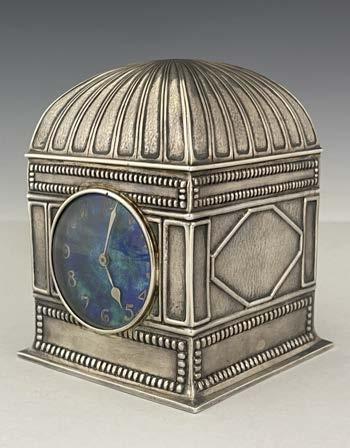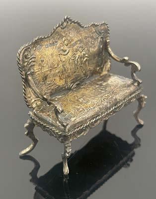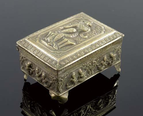 9 An Indian white metal casket, late 19th century, repousse decorated and embossed with Oriental figures, the hinged lid with a central image of Hindu deity Parvati on a tree stump, within floral ground cartouche and geometric bands, on four ogee bracket feet, 13cm wide, 8cm high, 9.5cm deep, 9.59ozt £40 - £70