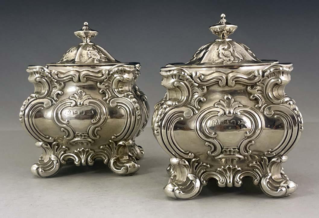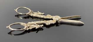 23 A pair of cast white metal grape scissors, probably Dutch, circa 1890, in the Rococo style, modelled with two pastoral figures beside foliate trunk columns and fruiting vines, on C scroll loop handles, 15.5cm long, 2.38ozt £40 - £60