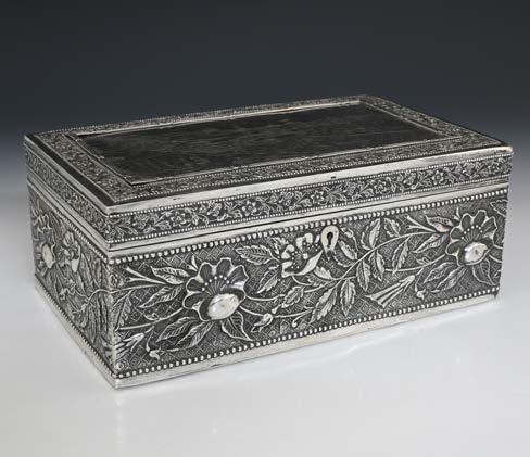 13 A twentieth-century white metal dressing table jewellery box, of rectangular form, the exterior decorated with chevrons and foliate scrolls, alternating between a stippled and green/yellow ground, the hinged cover opens to reveal a lined sectional interior, apparently unmarked, possibly Eastern, length 22.9cm, weight 566g/18.19ozt gross approx £80 - £120