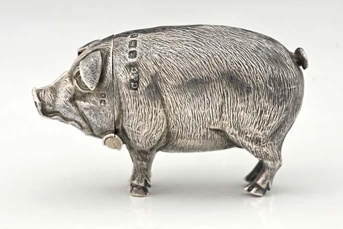 1 A late nineteenth or early twentiethcentury polished cast metal novelty mechanical butcher’s bell, modelled in the form of a pig or hog, both the snout and tail are articulated, the interior with bell mechanism, currently not functioning, apparently unmarked, possibly German, length 16.5cm approx £700 - £900