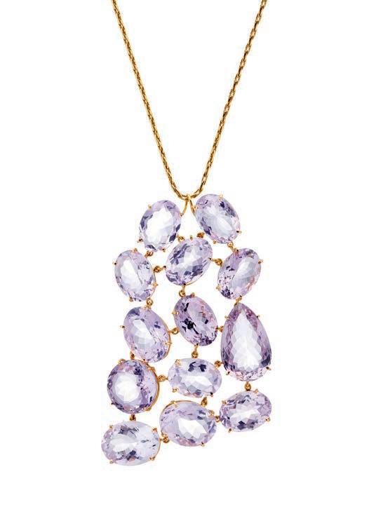 44 An 18ct gold vari-shape amethyst articulated multi-drop pendant, suspended from an 18ct gold chain, principal pear-shape amethyst estimated weight 19ct, clasp stamped 750, length of pendant 9.5cm, length of chain 39cm, 51.2g £400 - £600