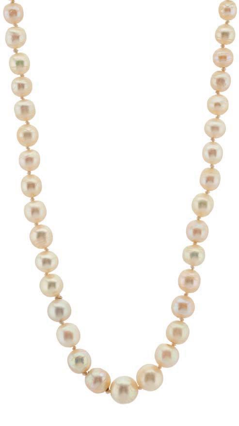 9. An early 20th century graduated pearl necklace, with pave-set diamond push-piece barrel clasp, pearls measure approximately 7.5 to 3mm, estimated total diamond weight 0.80ct, length 75cm £200 - £400