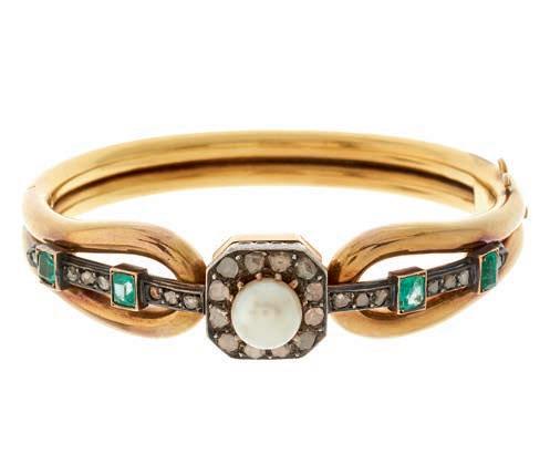 8. A late 19th century gold, pearl, emerald and rose-cut diamond hinged bangle, pearl measures approximately 8mm, inner diameter 5.6cm, 29.5g £800 - £1,200