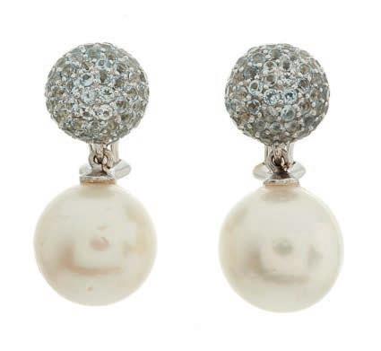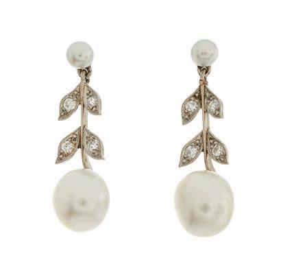 2 A pair of Edwardian natural pearl and single-cut diamond foliate drop earrings, with report from GCS, stating natural saltwater pearls, from approximately 3.6 to 8.9mm, no indications of treatment, estimated total diamond weight 0.20ct, H-I colour, VS2SI clarity, length 2.6 and 2.7cm, 4g £600 - £800
