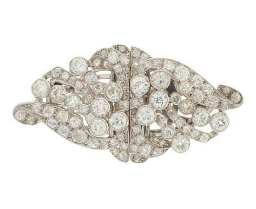 17 An early 20th century old-cut diamond openwork double clip lapel pin brooch, estimated total diamond weight 6ct, predominantly I-J colour, VS2-SI1 clarity, length 5.5cm, 22.7g £1,500 - £2,000