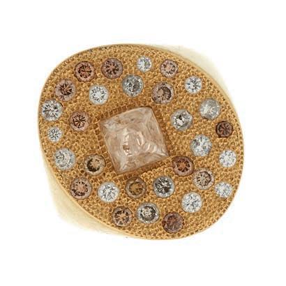 54 De Beers, an 18ct gold diamond and fancy coloured diamond Talisman dress ring, designed as a rough brown diamond, within a brilliant-cut diamond and brown diamond ovalshape surround, signed De Beers, serial A43636, estimated total brilliant-cut diamond weight 0.60ct, hallmarks for 18ct gold, ring size K, 7.2g £600 - £800