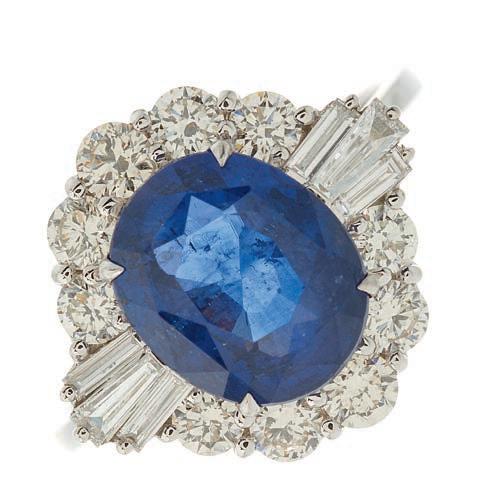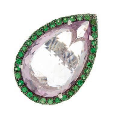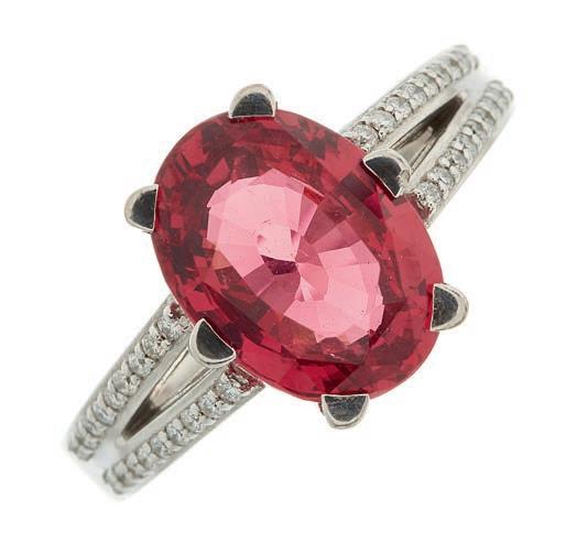 46. An 18ct gold purple tourmaline and diamond three-stone ring, tourmaline estimated weight 5ct, estimated total diamond weight 0.30ct, H-I colour, VS2-SI clarity, band stamped 750, ring size N1/2, 5.7g £1,200 - £1,800