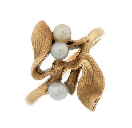 15 An Art Nouveau gold foliate engraved dress ring, with pearl trio highlight, pearls measure approximately 3.5 to 3.1mm, ring size M1/2, 4.3g £200 - £300