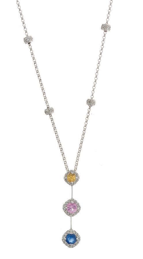 27. An 18ct gold vari-hue sapphire and brilliant-cut diamond triple cluster drop pendant, with knife-edge spacers, suspended from an integral trace-link chain with brilliant-cut diamond accent barrel highlights, estimated total diamond weight 0.50ct, hallmarks for 18ct gold, length of pendant 2.9cm, length of chain 39cm, 5.6g £220 - £320