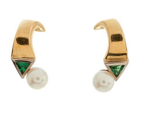 48 A pair of 18ct gold Colombian emerald drop earrings, each with pave-set diamond and seed pearl accent surround, to a similarly-designed surmount, two emeralds with report from The Gem & Pearl Lab, stating Colombia, negligible or moderate evidence of clarity enhancement, estimated total emerald weight 2ct, estimated total diamond weight 0.80ct, length 3.3cm, 4.7g £800 - £1,200