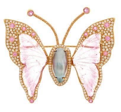 30. An 18ct gold pink sapphire and brilliant-cut diamond butterfly brooch, with baroque pearl central highlight, carved pink tourmaline accent wings and en tremblant pink sapphire antennae, total diamond weight 1.183ct, engraved to pin, stamped 750, length 5.6cm, 13.9g £1,200 - £1,800