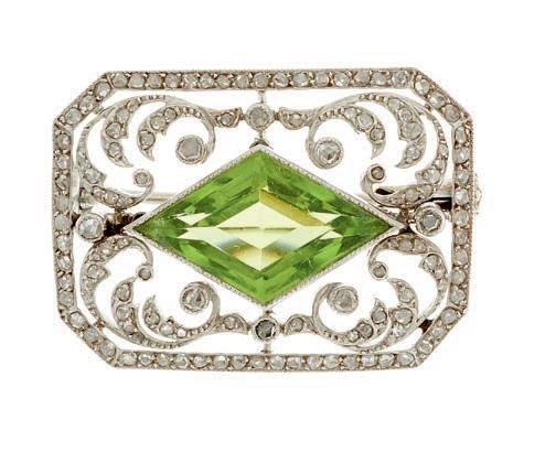 12. An early 20th century kite-shape peridot and rose-cut diamond openwork brooch, peridot estimated weight 6ct, foreign marks, length 2.8cm, 9.2g £300 - £400