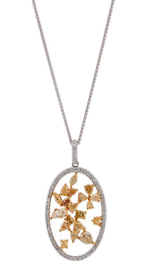 41 An 18ct gold vari-shape fancy coloured diamond pendant, with brilliant-cut colourless diamond surround and surmount, suspended from an 18ct gold fancy-link chain, total fancy coloured diamond weight 2.04ct, total colourless diamond weight 0.40ct, each engraved to surmount, stamped 18K, chain with hallmarks for 18ct gold, length of pendant 3.9cm, length of chain 40cm, 7.2g £1,200 - £1,800