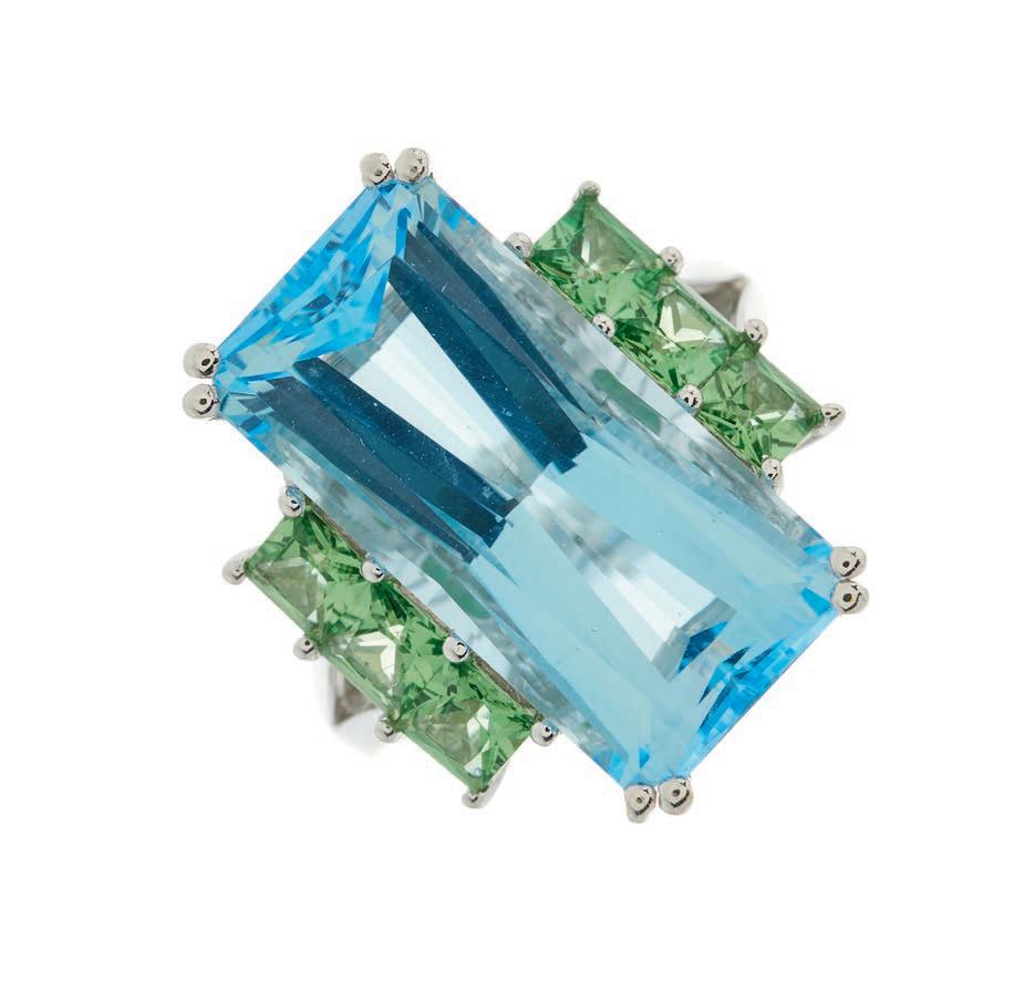 24 An 18ct gold blue topaz single-stone dress ring, with brilliant-cut diamond line sides and slightly tapered shoulders, topaz estimated weight 9ct, estimated total diamond weight 0.40ct, hallmarks for London 1979, ring size P, 7.2g £200 - £300