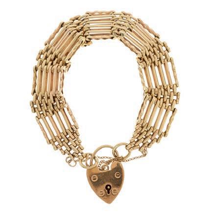 20. Liberty & Co., an Arts & Crafts gold mother-of-pearl bracelet, with partially concealed push-piece clasp and safety chain, design number 8003 in the Liberty Jewellery sketch book, apparently unsigned, length 19.7cm, 9g £400 -