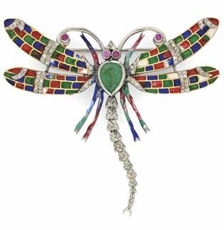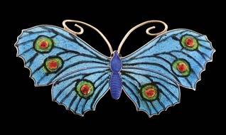 14 Charles Horner, an Arts and Crafts silver and enamelled pendant, Chester 1909, in the form of a winged scarab, champleve enamel wings in green, blue and purple, suspended on two chains united by a triangular plaque, 4.5cm wide, 6.1g £180 - £220