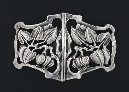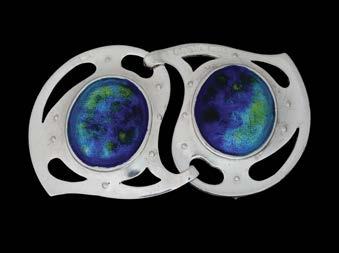 20 Murrle Bennett, an Arts and Crafts silver and enamelled buckle, import marks London 1903, the two reticulated asymmetircal cartouche form plaques with central oval roundels in blue green enamel, studded with rivet motifs, 7.5cm long, 1ozt £250 - £350